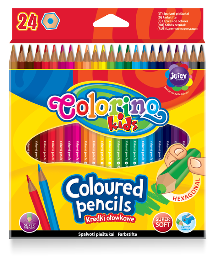 Kredki ołówkowe Colorino Kids wyróżnia niezwykle miękki i jednocześnie bardzo wytrzymały rysik oraz doskonały wybór soczystych, intensywnych kolorów. Heksagonalny kształt zapewnia wygodę oraz gwarantuje, że kredka nie stoczy się ze stołu.